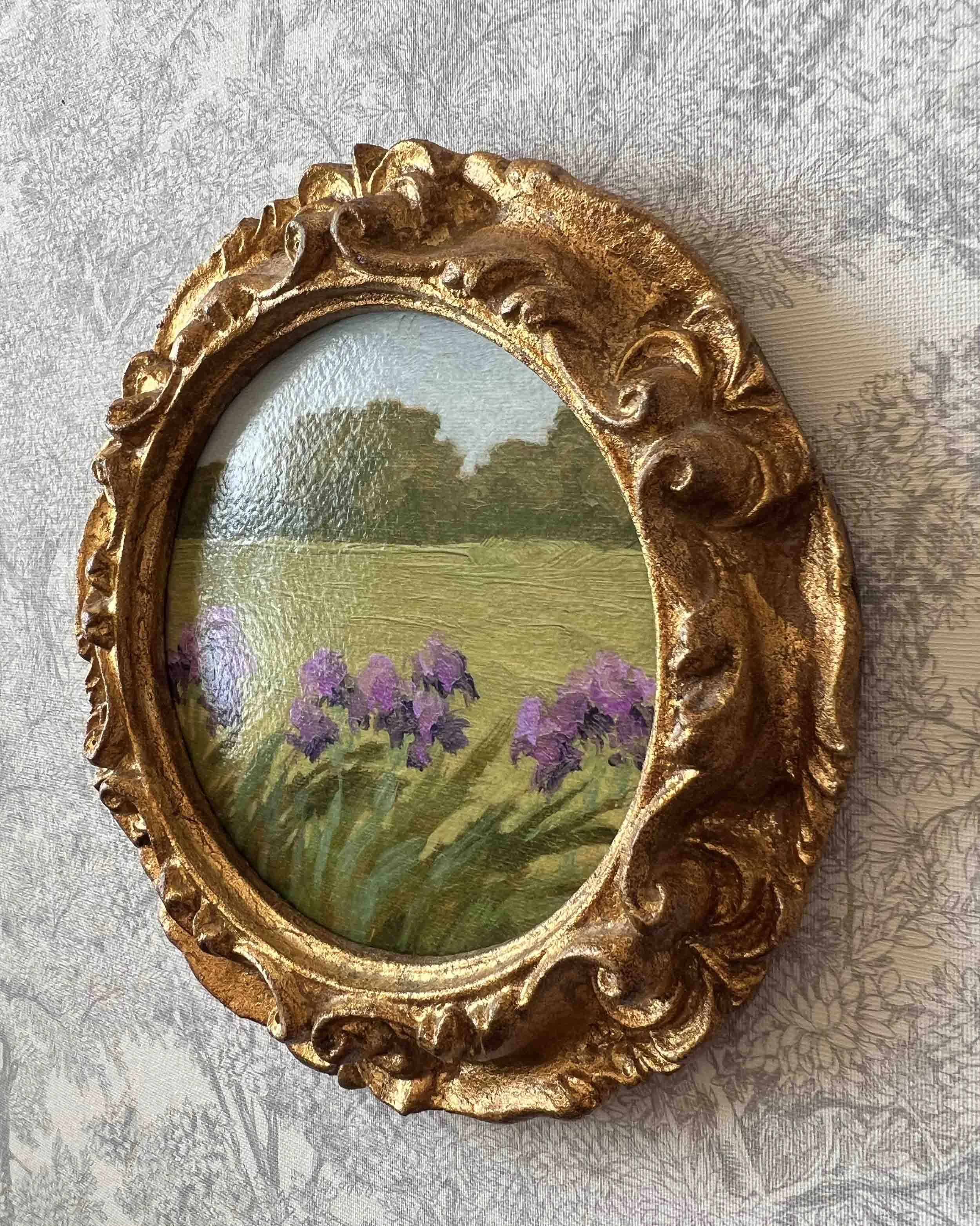 This is a framed print of my original painting "Irises in Spring". The print is framed in a vintage gilt composite frame made in Italy with a total framed dimensions of 6.75” diameter x 7/8" deep.